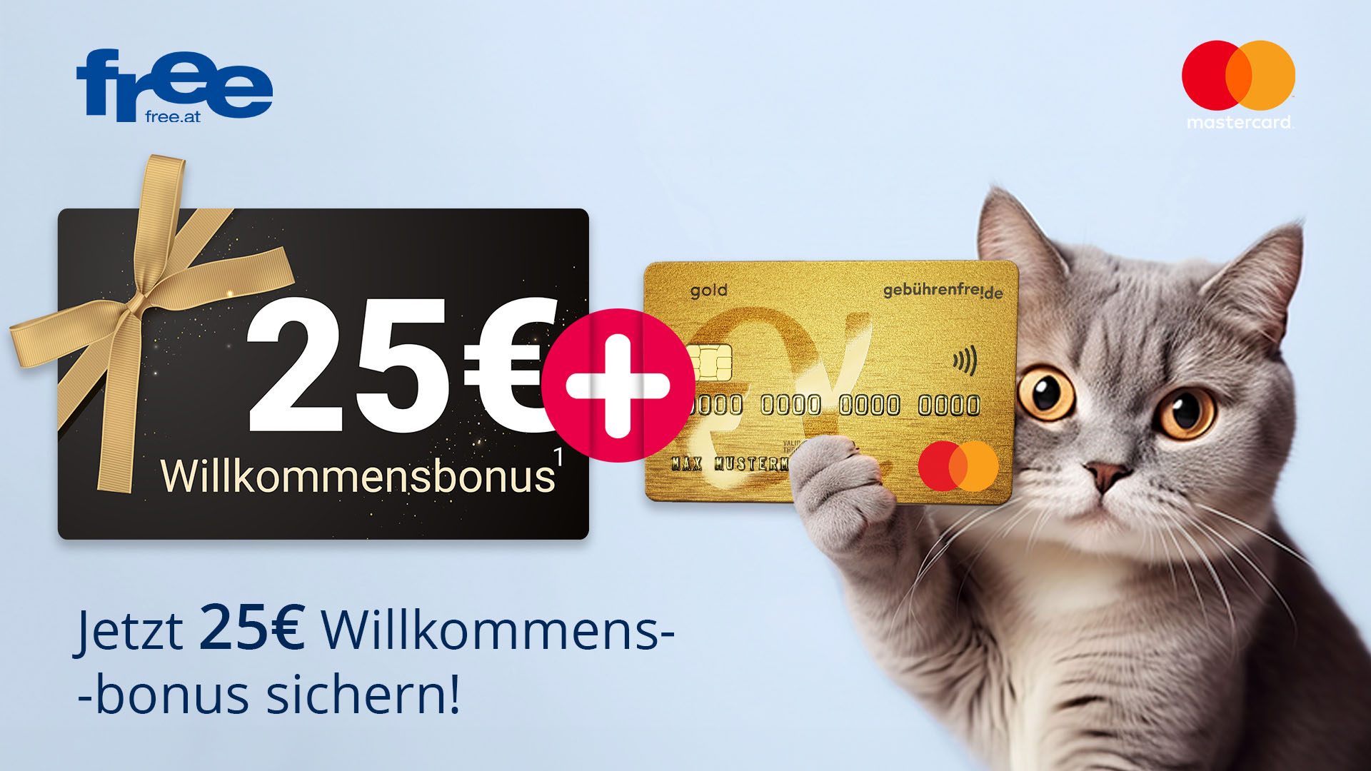 Jetzt die free Mastercard Gold beantragen, bis zum Ende des Folgemonats der Onlinebeantragung mindestens einmal nutzen und Sie erhalten 25 € Willkommensbonus *!